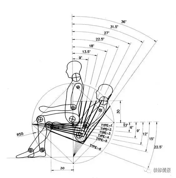 坐面向后倾一定的角度,有利人体重量分移至靠背的下半部与臀部坐骨结节点。而且,随着姿势的改变,后倾角及其与靠背的夹角还有关联性,一般情况下,两个倾角越大,休息性越强。
