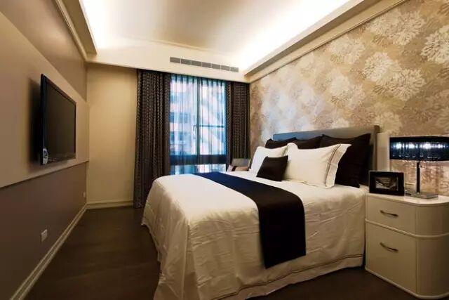 背景墙贴上墙纸变得很有舒适感。靠近衣柜地方用镜面装点,形成独特的层次感。